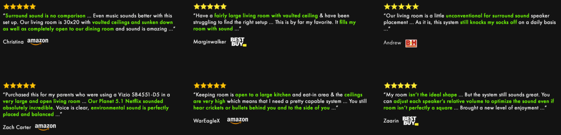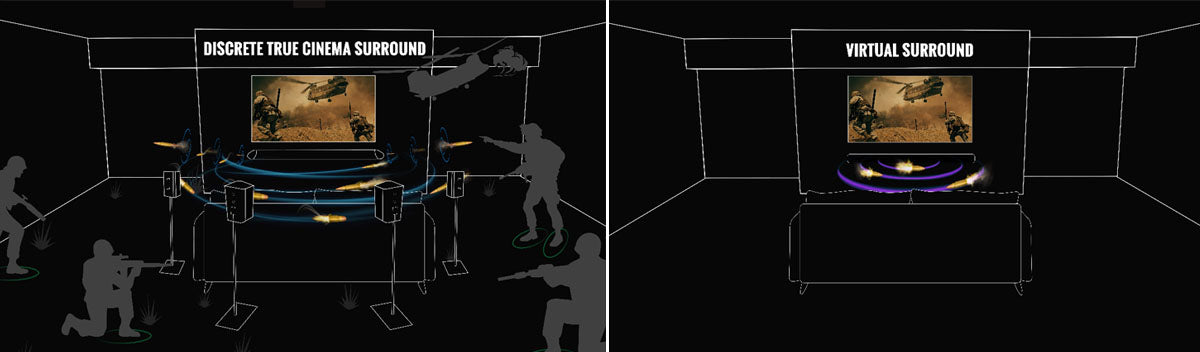 In virtual surround setups, sound is outputted from the front to bounce off the room's walls to reach the listener from the sides and the back. However, this only works in an enclosed room. Having rear surround speakers eliminates the reliance on a room's shape or size, allowing listeners to get the same cinema quality experience in any space.